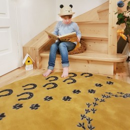 The FARM ANIMAL TRACK 3D children's rug is a perfect choice for a child who likes animals found in the countryside. On the rug, in a warm mustard color, we can see the footprints of a horse shoe, a dog's paws, a chicken and a duck. The pattern on the rug shows the trodden paths left by animals living on the farm, which stimulates the imagination of the child and develops interest in the world of nature. It is a perfect rug for both boys' and girls' rooms. Its pattern encourages active play, where a child can walk "step by step" on animal tracks with their own feet or with plush toys. Playing on the ANIMAL TRACK rug is also an excellent opportunity for the child's linguistic development, because there are so many possibilities to create stories about the animals that have left tracks for us, to imitate their voices and to creatively invent new adventures. The ANIMAL TRACK rug can attract the eye because it is made in a special 3D technique. The traces of animal tracks are concave, because the pile is of a different height. When you close your eyes, you can feel each track with your hand and guess which of your animal friends left it on the rug. This is a great idea for developing tactile sensitivity in children.
