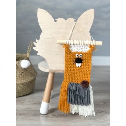 The SQUIRREL KATE macrame is hand-made of cotton string, yarn and a pine stick. It is an extraordinary decoration for a child’s room.