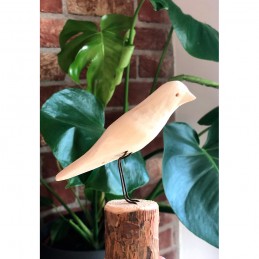 The bird is hand-made, sculpted from a linden tree. It has legs made from wire. This decoration isn't intended for toddlers.