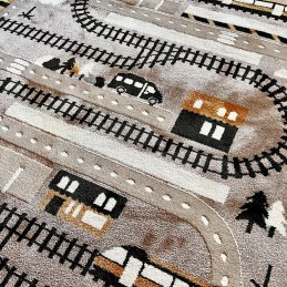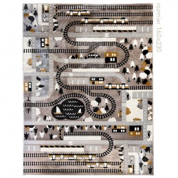 The carpet pattern depicts a city full of streets, houses and cars. There are also parking lots, squares, a gas station, a lake with sailboats, trains and tracks. Part of the pattern has been made in 3D, which makes the appearance of the carpet even more attractive for the child (e.g. the street is concave and the stripes are convex). On the 160x230 cm carpet we will see a larger city plan enriched with an additional railway station, a sidetrack and a park.