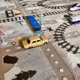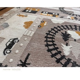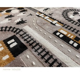 Благодаря использованию цветовой гаммы, включающей в себя преимущественно бежевый и серый цвет (с небольшим добавлением белого, синего и медового), мы создали ковер, который станет отличным дополнением детской комнаты без ощущения давления. Умеренные цвета ковра не вызывают у ребенка усталости и раздражения от чрезмерного визуального воздействия. Нежные и успокаивающие цвета ковра "УЛИЦИ И ЖЕЛЕЗНОДОРОЖНЫЕ ПУТИ" создают расслабляющую атмосферу, позволяя ребенку наслаждаться игрой и одновременно отдыхать.
