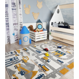 Он выполнен из полипропилена - синтетической замены шерсти, что дает нам преимущества в виде доступной цены, легкости ухода и антиаллергических свойств, благодаря чему ковер идеально подходит для детской комнаты. Он плотно тканый, что делает его очень мягким и приятным на ощупь. Интересный дизайн улиц, экскаваторов и строительства города приглашает к игре, стимулируя детское воображение. На ковре наш малыш может кататься на машинках по круговому движению и извилистым улицам. Припарковаться у школы или на строительной площадке, где стоят краны и постоянно подъезжают грузовики, сбрасывающие горы песка. Или, может быть, наш ребенок захочет построить свой дом из кубиков? Интересно, на какой улице появится его постройка?