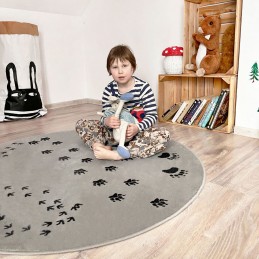 Круглий дитячий килим СІРИЙ СЛІДИ - ЛІСОВА ТЕМА 3D