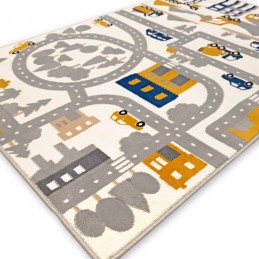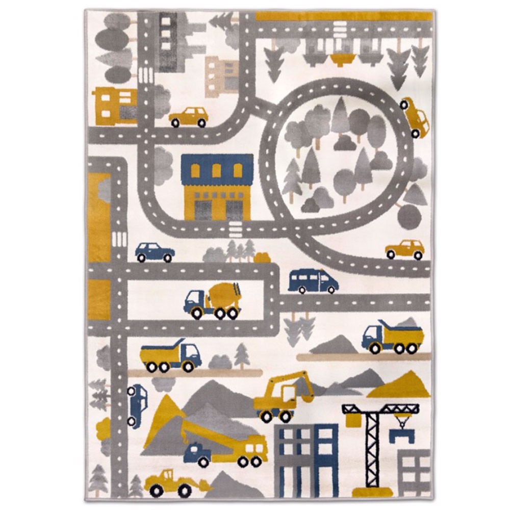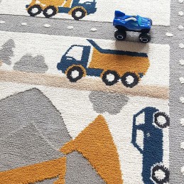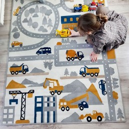 Він виготовлений з поліпропілену - синтетичної альтернативи вовни, що надає йому переваги у вигляді доступної ціни, легкості догляду та антиалергенних властивостей. Цей килим ідеально підходить для дитячої кімнати. Він щільно тканий, що робить його дуже м'яким та приємним на дотик. Цікавий дизайн вулиць, екскаваторів і будівництва міста запрошує до гри, стимулюючи дитячу уяву. На цьому килимі наше дитя може їздити машинками по круговому русі та вуличках. Припаркуватися біля школи або на будівельному майданчику, де стоять крани і постійно під'їжджають вантажівки, що скидають гори піску. Або, можливо, наше дитя захоче побудувати свій власний будинок із кубиків? Цікаво, на якій вулиці з'явиться його споруда? Затримка кольорів і дизайн із міським будівництвом роблять килим місцем захоплюючої гри та прикрасою кімнати, не перевантажуючи дитячу яскравими кольорами.
