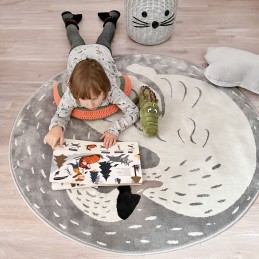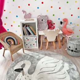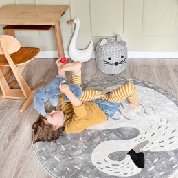 Сiро-біла кольорова гамма цього килима універсальна і пасує до будь-якої дитячої кімнати. На серому фоні з морськими відтінками і зображеними хвилями ми бачимо білого лебедя, готового до польоту. Використання ворсу з короткими волосками на дзьобі лебедя створює ефект 3D, що покращує не тільки зовнішній вигляд килима, але й запрошує дитину грати на ньому.