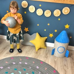 Він також знайде своє місце у спальні чи вітальні, де можна сховати ковдри та подушки після невеликого сну. Кошик для іграшок РАКЕТА виготовлений вручну з паперового плетіння, покритого фарбою та водорозчинним лаком, відповідно до стандарту ПН-ЕН 71-3 щодо міграції шкідливих елементів. Завдяки цьому ми можемо бути впевнені, що наш кошик є безпечним для дітей. Кошик РАКЕТУ, сховище для різних речей, спонукає стежити за порядком, адже ховати в ньому предмети - це само собою весело і виглядає так мило, що хочеться мати її у себе вдома. Приглушені кольори роблять його ідеальним для будь-якого інтер'єру.