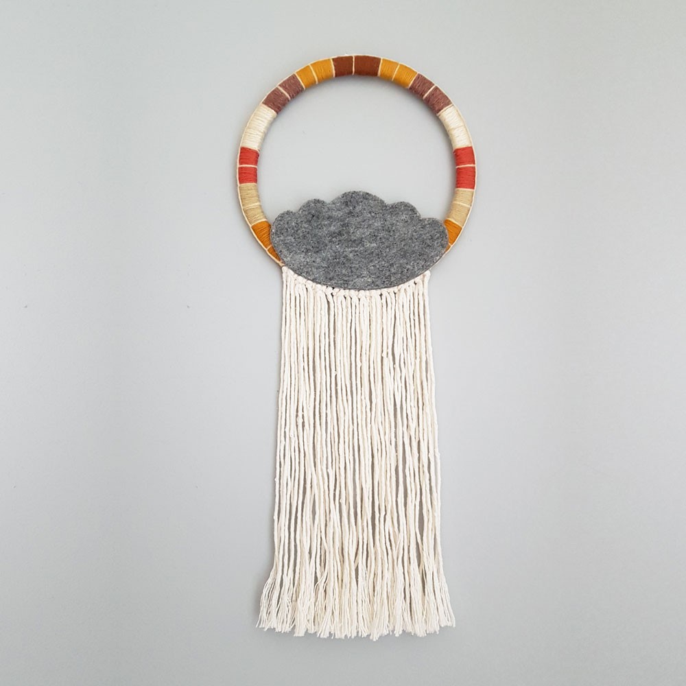 Бежева веселка з сірою хмарою та каскадом ниток макраме - ідеальна прикраса для кімнати дівчинки чи хлопчика. Прикраса із зображенням веселки на хмарі добре виглядає у будь-якій дитячій кімнаті завдяки своїм нейтральним кольорам. Підвісна прикраса складається з дерев'яного обруча, обмотаного пряжею приглушених відтінків коричневого кольору, і милої хмаринки з каскадом білих бавовняних шнурів макраме. Прикраса веселка на хмарі можна повісити в будь-якому місці кімнати вашої дитини: на стіні, на меблях, над ліжком, на вікні - скрізь, де вам подобається