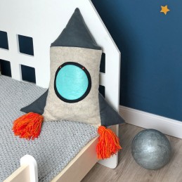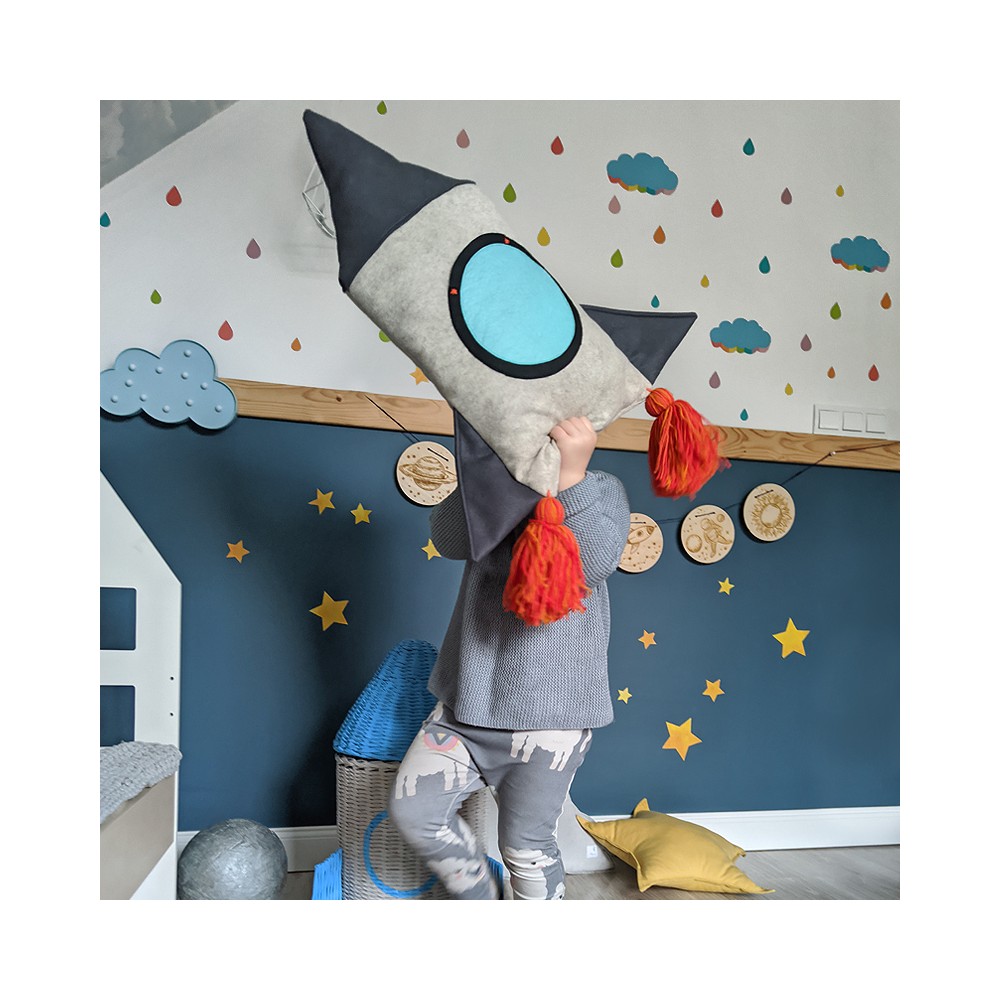 Велика декоративна подушка КОСМІЧНА РАКЕТА виготовлена із фетру. Це робить подушку не тільки м'якою та легкою, але й гнучкою та міцною. Триколірна КОСМІЧНА РАКЕТА прикрашена пензликами, що імітують полум'я з кольорової пряжі. У вікні є практична кишеня для маленьких скарбів нашого малюка.