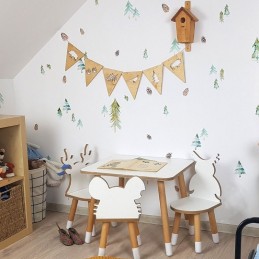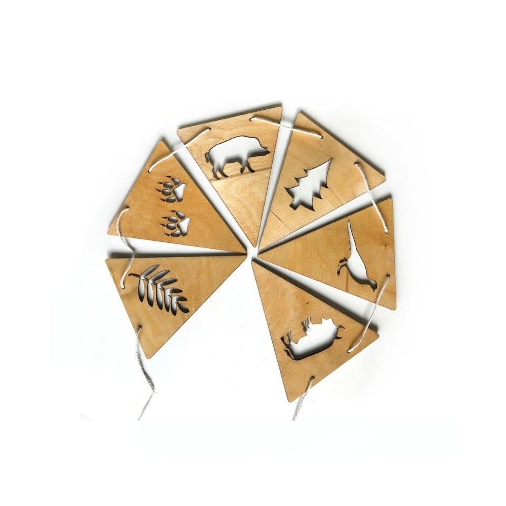 Прикраси для дитячої кімнати з дерева, наприклад дерев'яні прапорці, не лише прикрашають, а й додають затишку та лісовий клімат усередині. Дерев'яні прапорці – оригінальна прикраса дитячої кімнати. Завдяки тому, що прапорці двосторонні, їх можна повісити на стіну або біля ліжка. Вони також добре виглядатимуть на вікні. Кожен елемент представляє інший візерунок. Чи дізнається ваша дитина і назве певні лісові тварини?Тітиви та прапорці в наборі йдуть окремо, тому ви можете комбінувати їх на свій розсуд. Цей продукт є чудовим доповненням не тільки для кімнати маленького дослідника, але й для маленької дослідниці.
